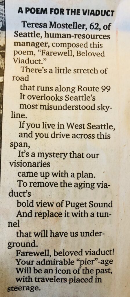 I submitted the below tongue-in-cheek poem to the Seattle Times, and they published it. I’m not too crazy about the line format or some of the grammar. However, I wanted to share it because it’s a slice of Seattle history. (I’ve since gotten over it.)